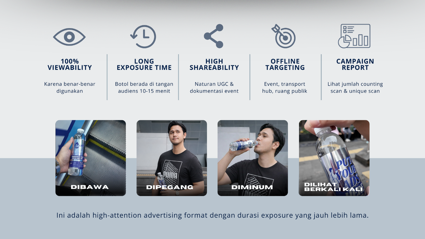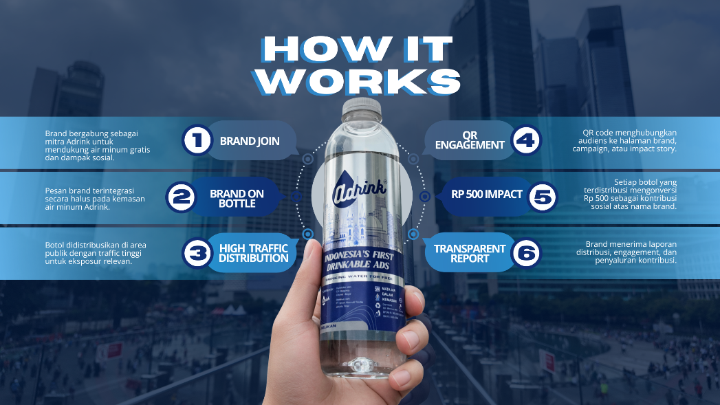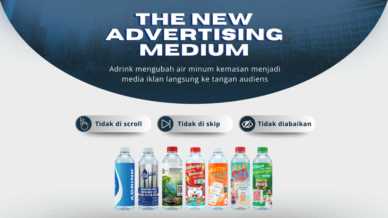 Adrink menghadirkan cara baru bagi brand untuk benar-benar hadir di tengah masyarakat. Melalui media botol air minum yang dibagikan secara gratis, brand Anda tidak hanya terlihat, tapi juga disentuh, dibawa, dan digunakan langsung oleh audiens.